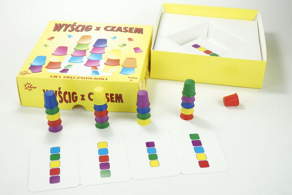 Gra zręcznościowa polegająca na możliwie szybkim układaniu wieży z kolorowych naparstków wg wzoru z obrazka wylosowanej karty.
