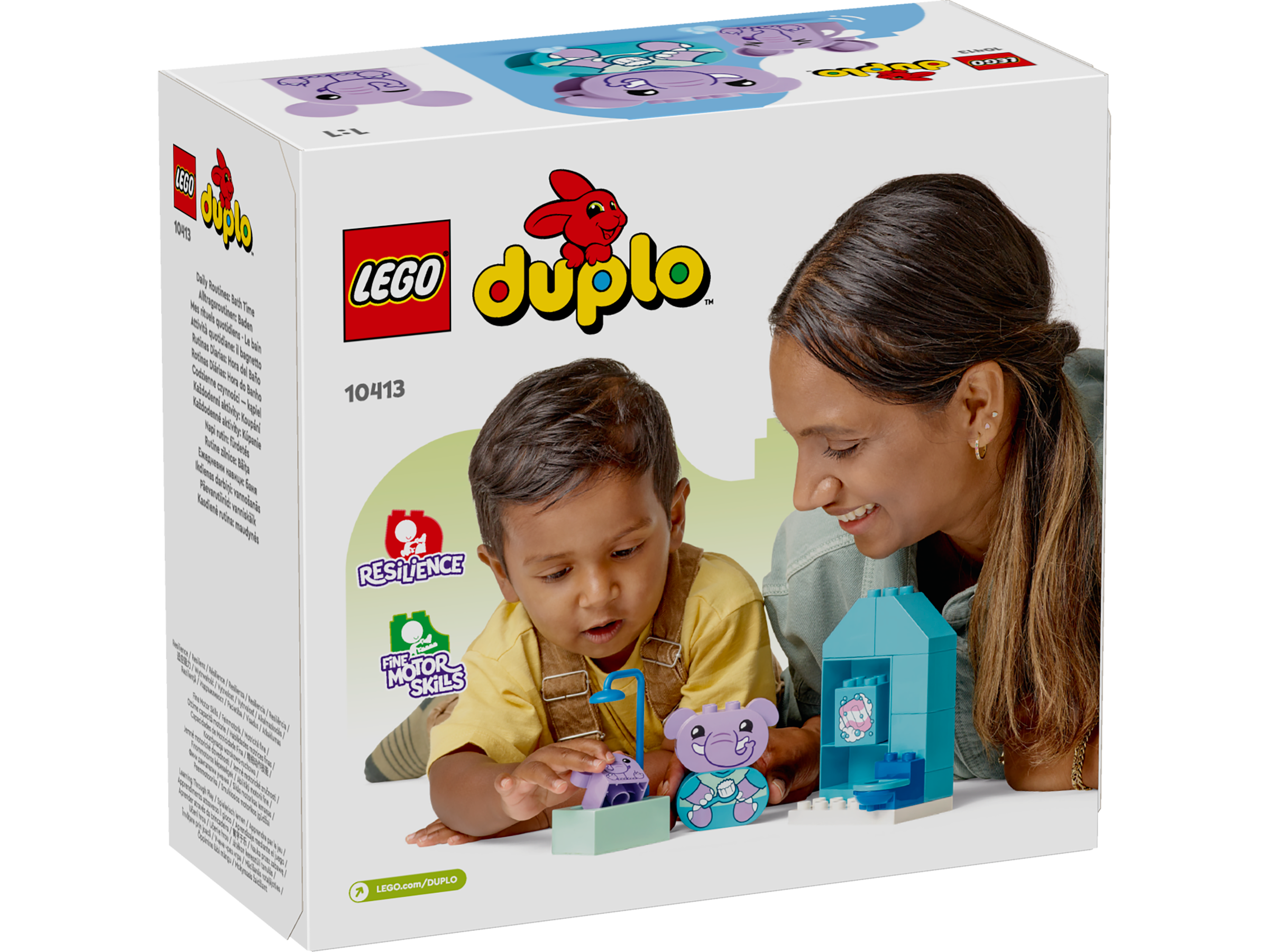 • Zabawka edukacyjna — zawiera dwie figurki słoni, toaletę, wannę i prysznic zbudowane z solidnych klocków LEGO® DUPLO®, a także elementy do zabawy w kąpiel