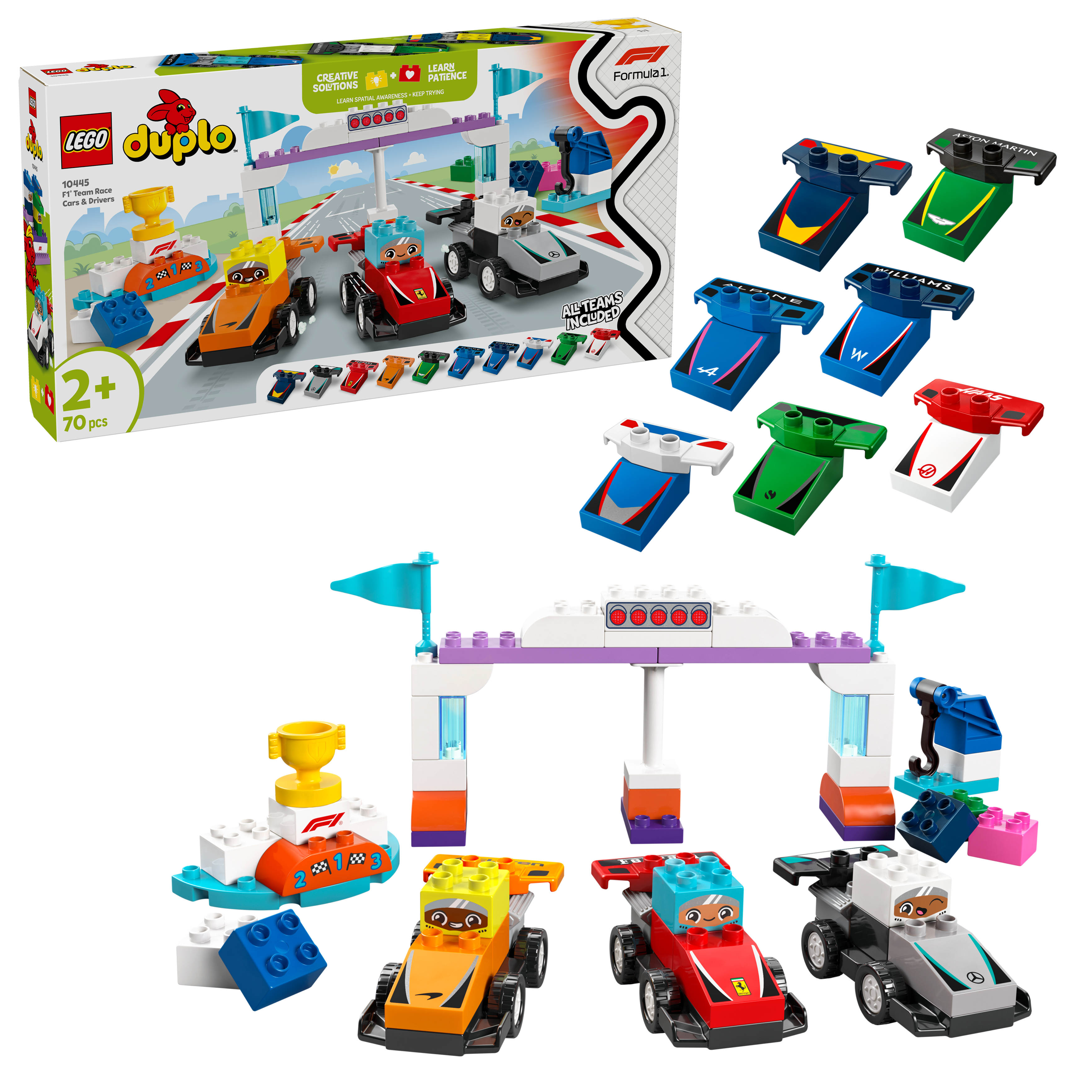• Kreatywna zabawa dla całej rodziny — podziel się swoją pasją do Formuły 1® ze swoją pociechą dzięki zestawowi z 10 bolidami do zbudowania, trzema klockami przedstawiającymi kierowców, podnośnikiem, światłami startowymi i podium