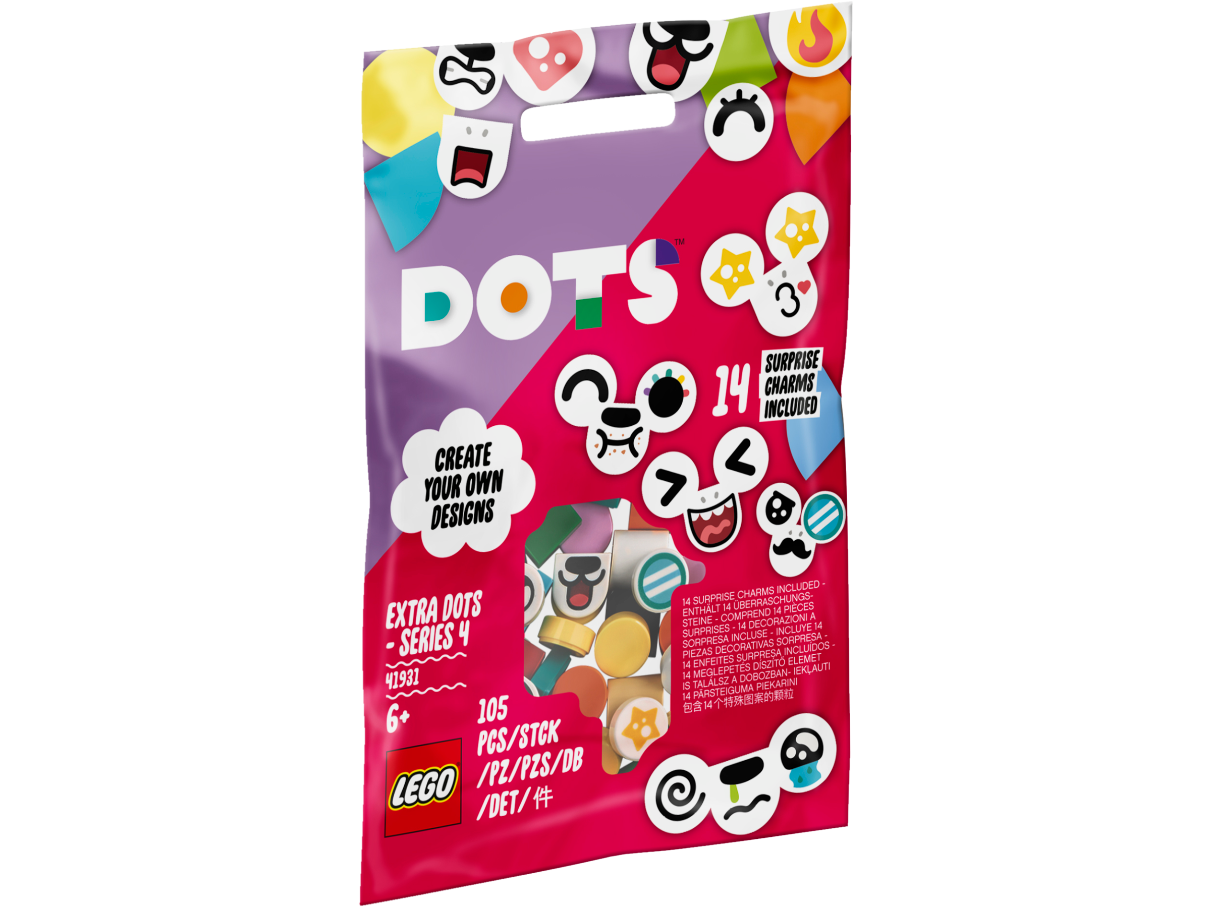 • Otwarcie woreczka z płytkami Dodatki DOTS – seria 4 (41931) to wielki moment dla każdego miłośnika prac ręcznych. Nowe kolory i płytki z nadrukami sprawią, że będzie to udany prezent dla chłopców i dziewczynek w wieku od 6 lat.
