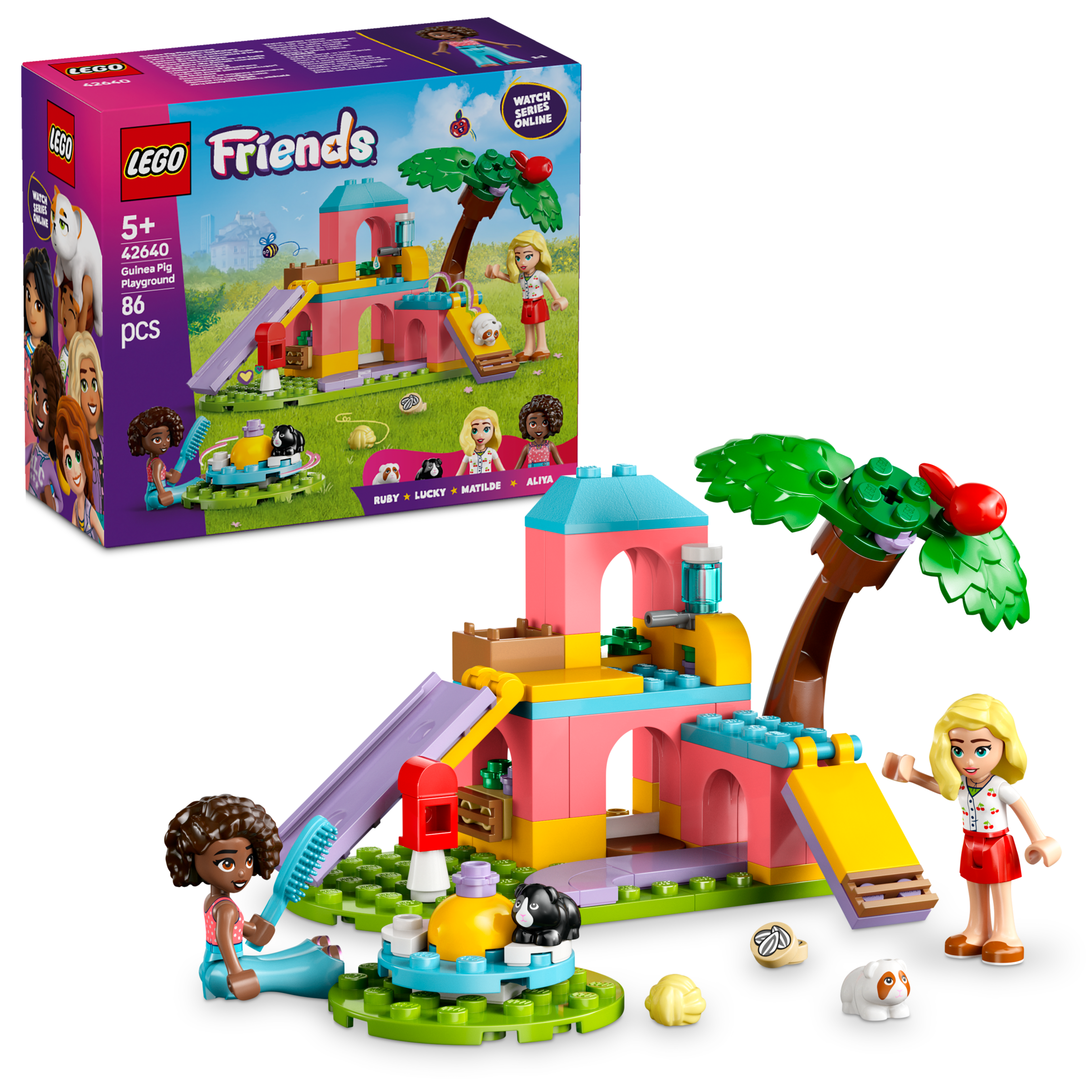 • Dwie minilaleczki i dwie figurki świnek morskich — ta zabawka rozwijająca umiejętności społeczne i emocjonalne pozwala dzieciom opowiedzieć historię Aliyi i Matyldy, które uwielbiają świnki morskie