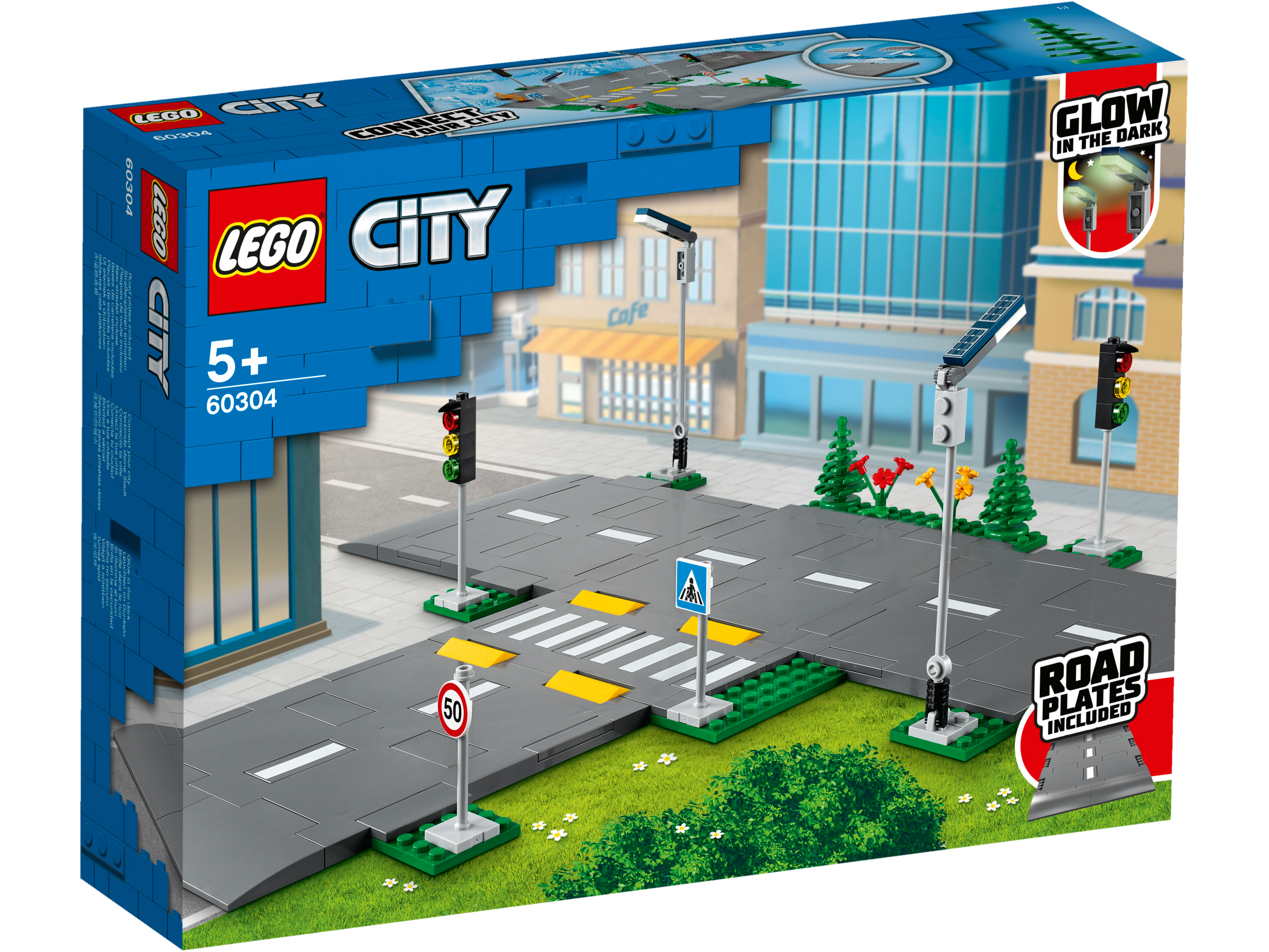 • Co jest w pudełku? Pięć płyt drogowych LEGO® z oznaczeniami pasów, progami zwalniającymi i przejściem dla pieszych, a do tego świecące w ciemności latarnie, zabawkowa sygnalizacja świetlna, znaki drogowe, drzewa i elementy zieleni.
