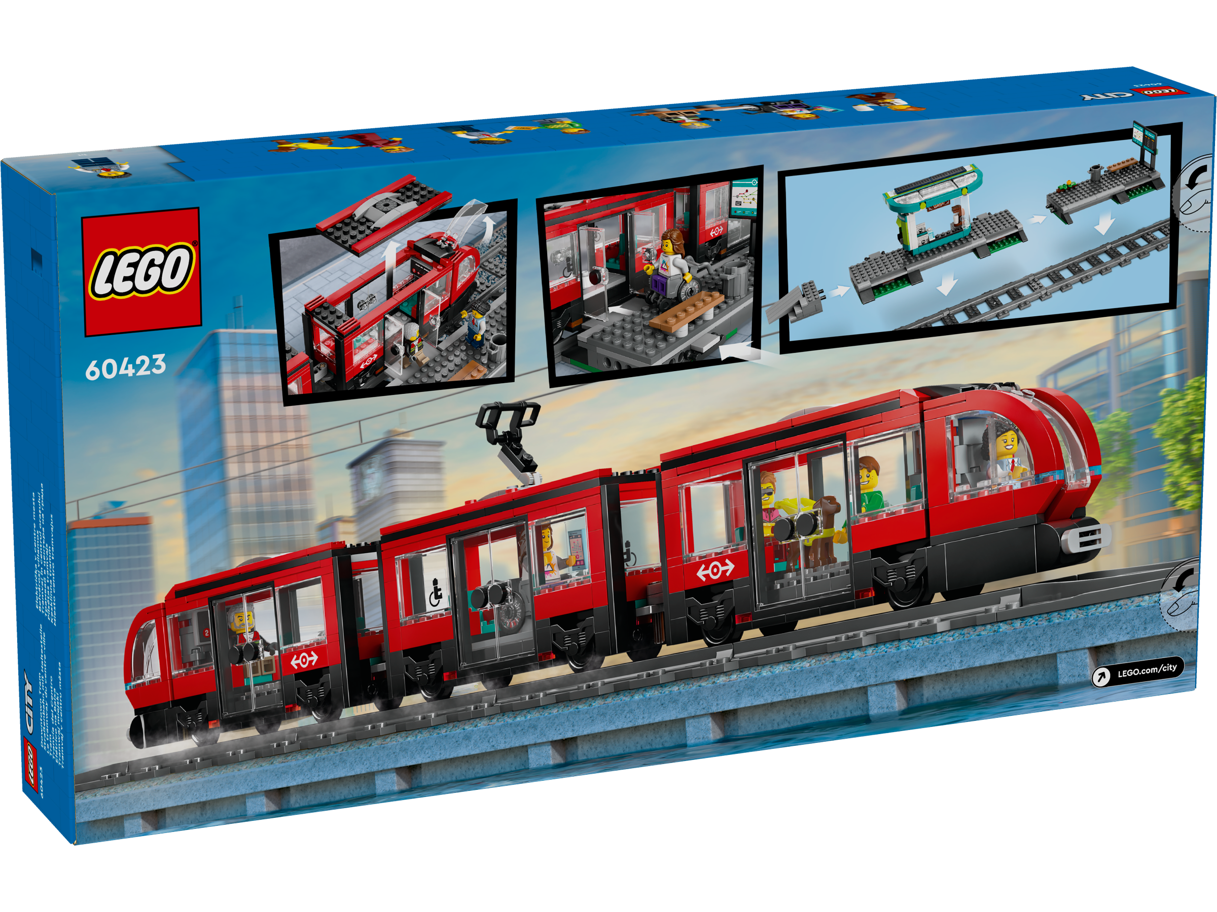 • Zestaw dla dzieci, które uwielbiają się bawić — zabawkowy tramwaj ma siedzenia dla minifigurek i otwierane podwójne drzwi, a na peronie stacji znajdują się wysuwane płyty pomostowe umożliwiające wsiadanie
