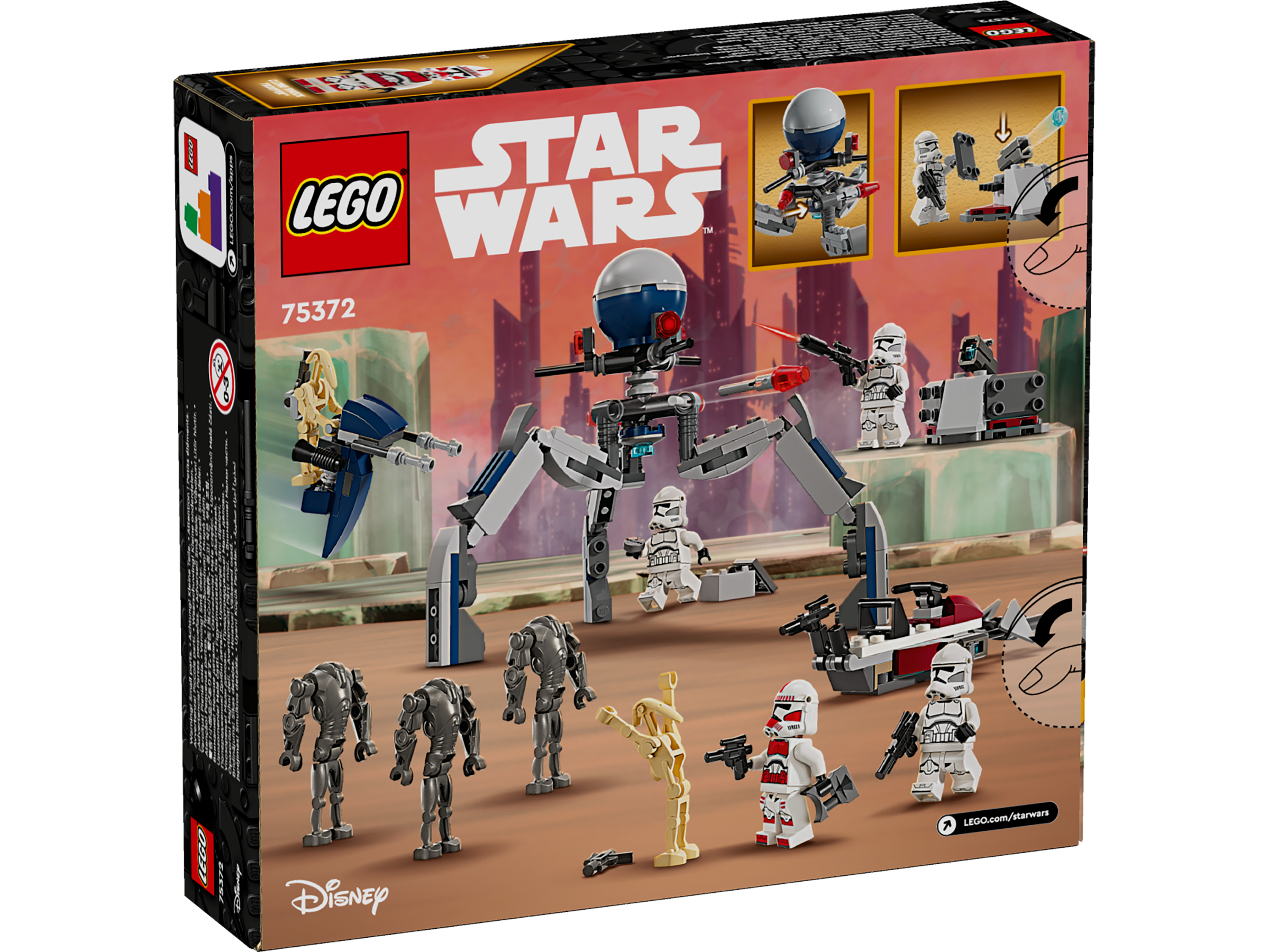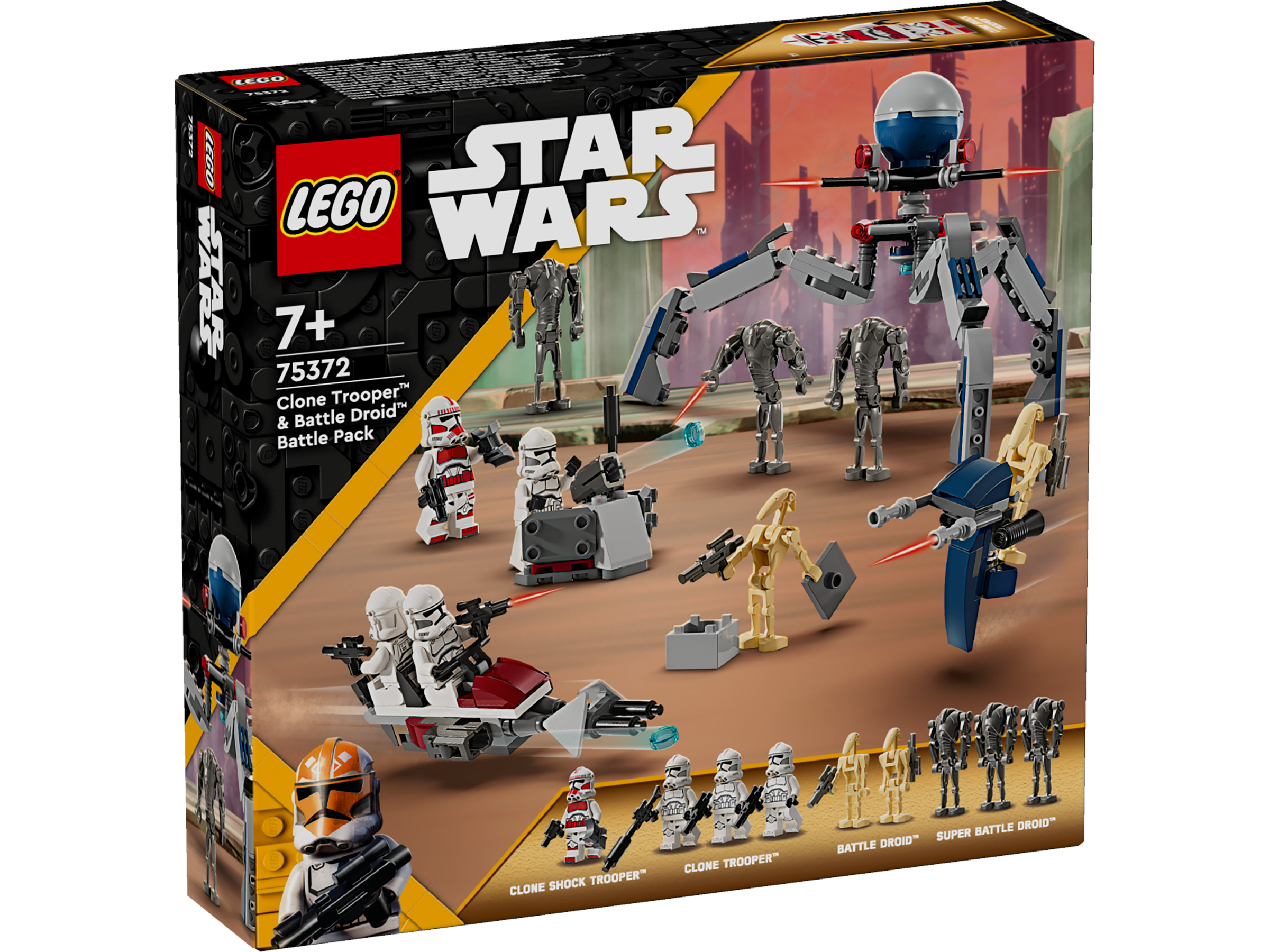 • Cztery minifigurki LEGO® Star Wars™ i pięć figurek LEGO do zabawy — żołnierz-klon z oddziału uderzeniowego, trzech żołnierzy-klonów, trzy superdroidy bojowe i dwa droidy bojowe z akcesoriami