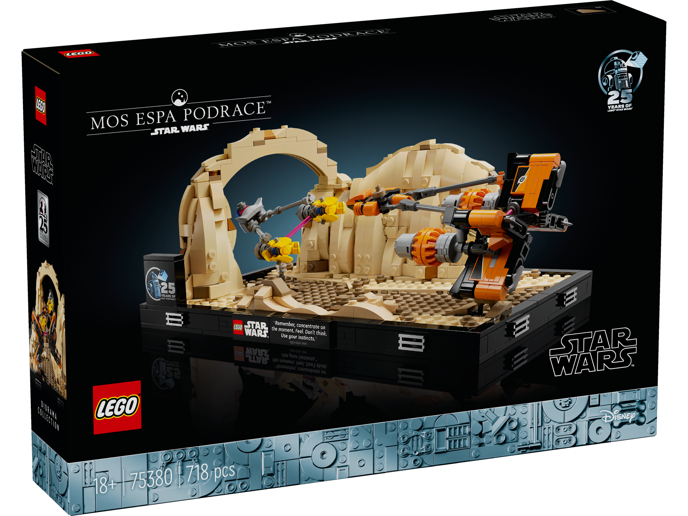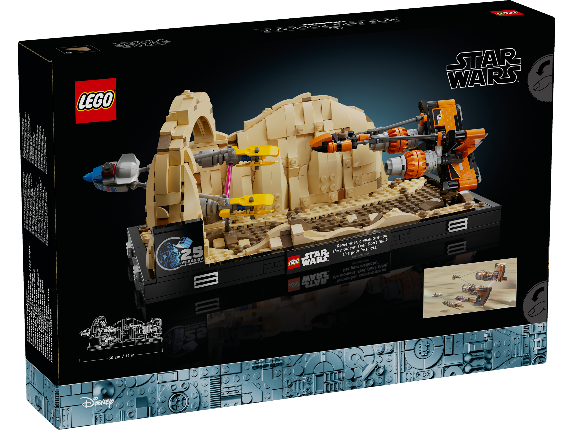 • Model do postawienia na półce — zestaw zawiera odcinek z kanionem toru do wyścigów ścigaczy w Mos Espa na Tatooine, a także klocek z okazji 25-lecia zestawów LEGO® Star Wars™ oraz tabliczkę z cytatem z Qui-Gon Jinna
