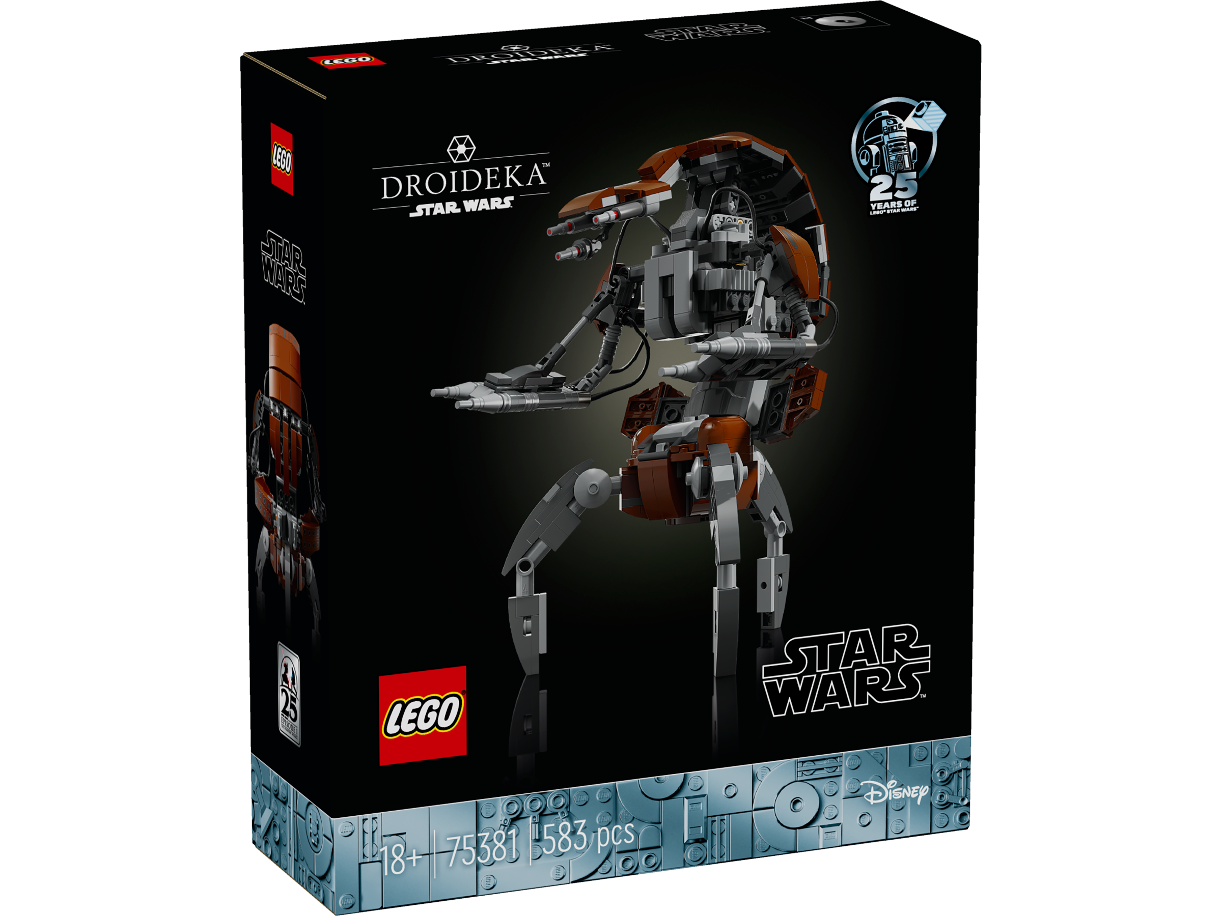 Przypomnij sobie film „Gwiezdne Wojny: Mroczne widmo” dzięki zbudowanej z klocków figurce droida-niszczyciela. Poruszaj ramionami droida w przód i w tył, imitując strzelanie. Zmień sposób przyczepienia nóg, aby nadać Droidece kultowy kulisty kształt. Na koniec ustaw swoje dzieło obok podstawki z tabliczką informacyjną i klockiem z okazji 25-lecia zestawów LEGO® Star Wars™ oraz małej figurki droida LEGO – Droideki.