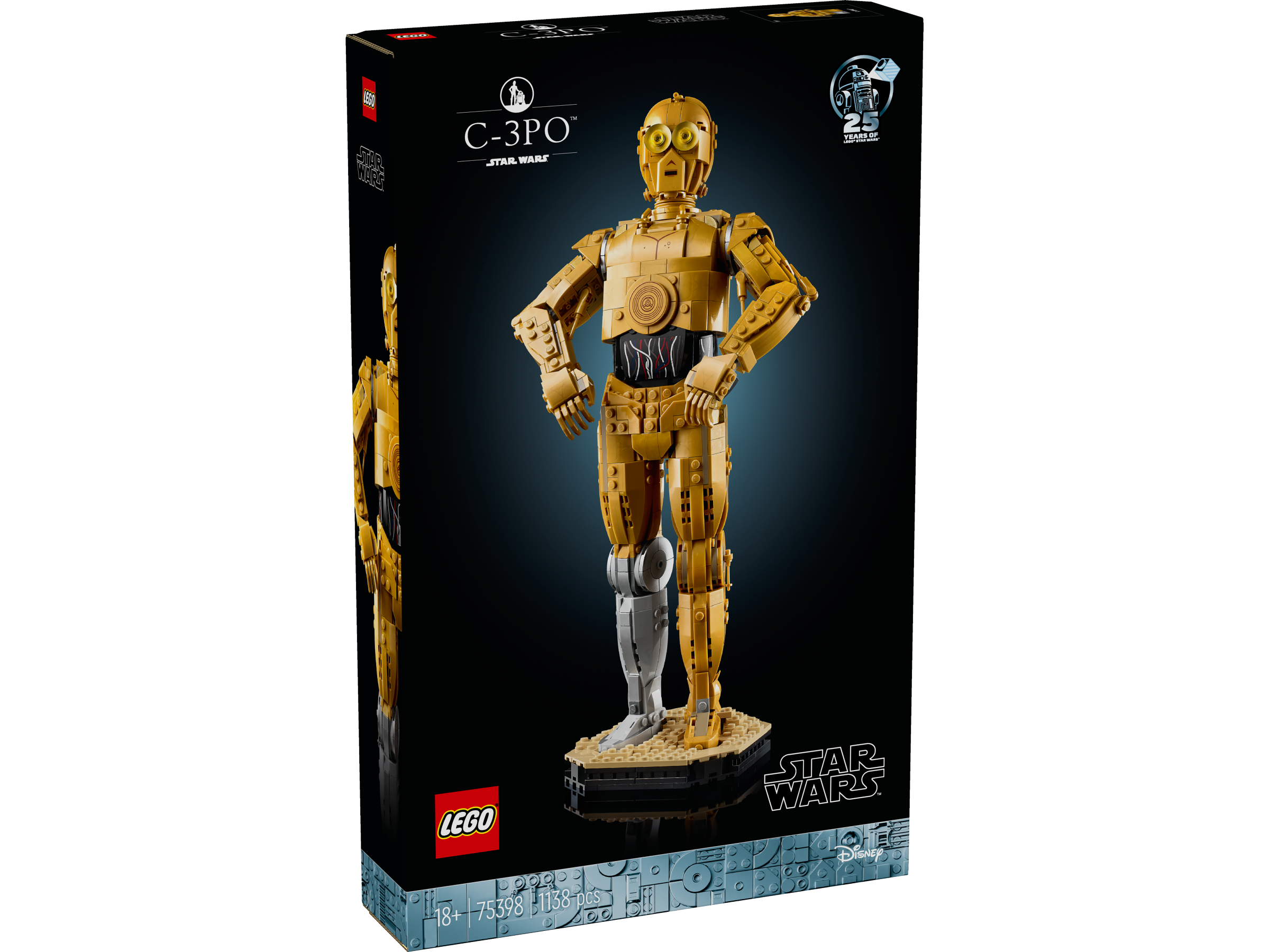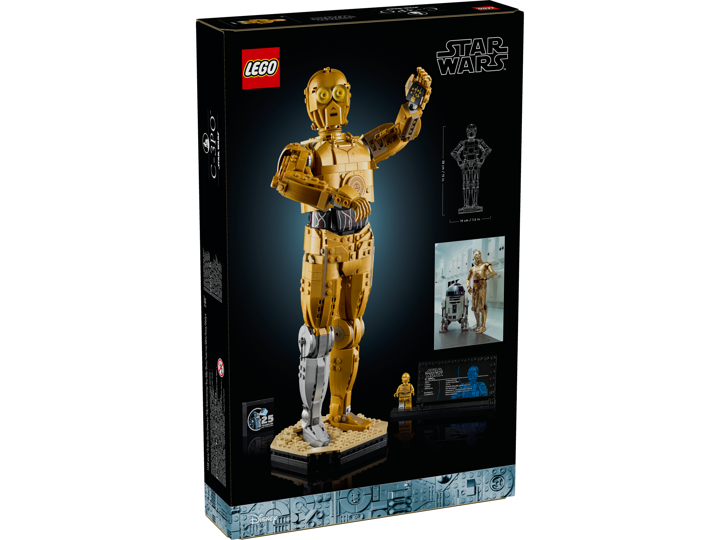 • Element z okazji 25-lecia — zestaw zawiera podstawkę z płytką z informacjami o C-3PO i miejscem na minifigurkę LEGO® C-3PO, a także klocek LEGO Star Wars™ z okazji 25-lecia zestawów