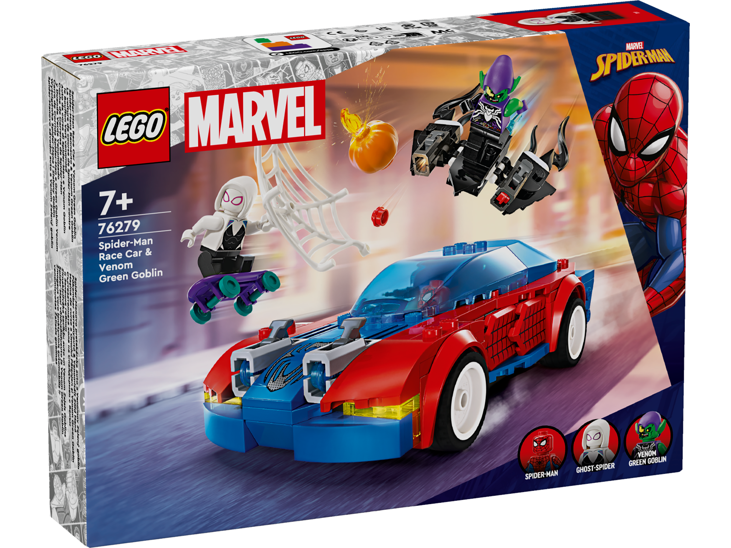 • Zabawka do zbudowania i zabawy — zawiera samochód do zbudowania, broń, akcesoria, minifigurki bohaterów LEGO® Marvel Spider-Mana i Ghost-Spider oraz minifigurkę zvenomowanego Zielonego Goblina