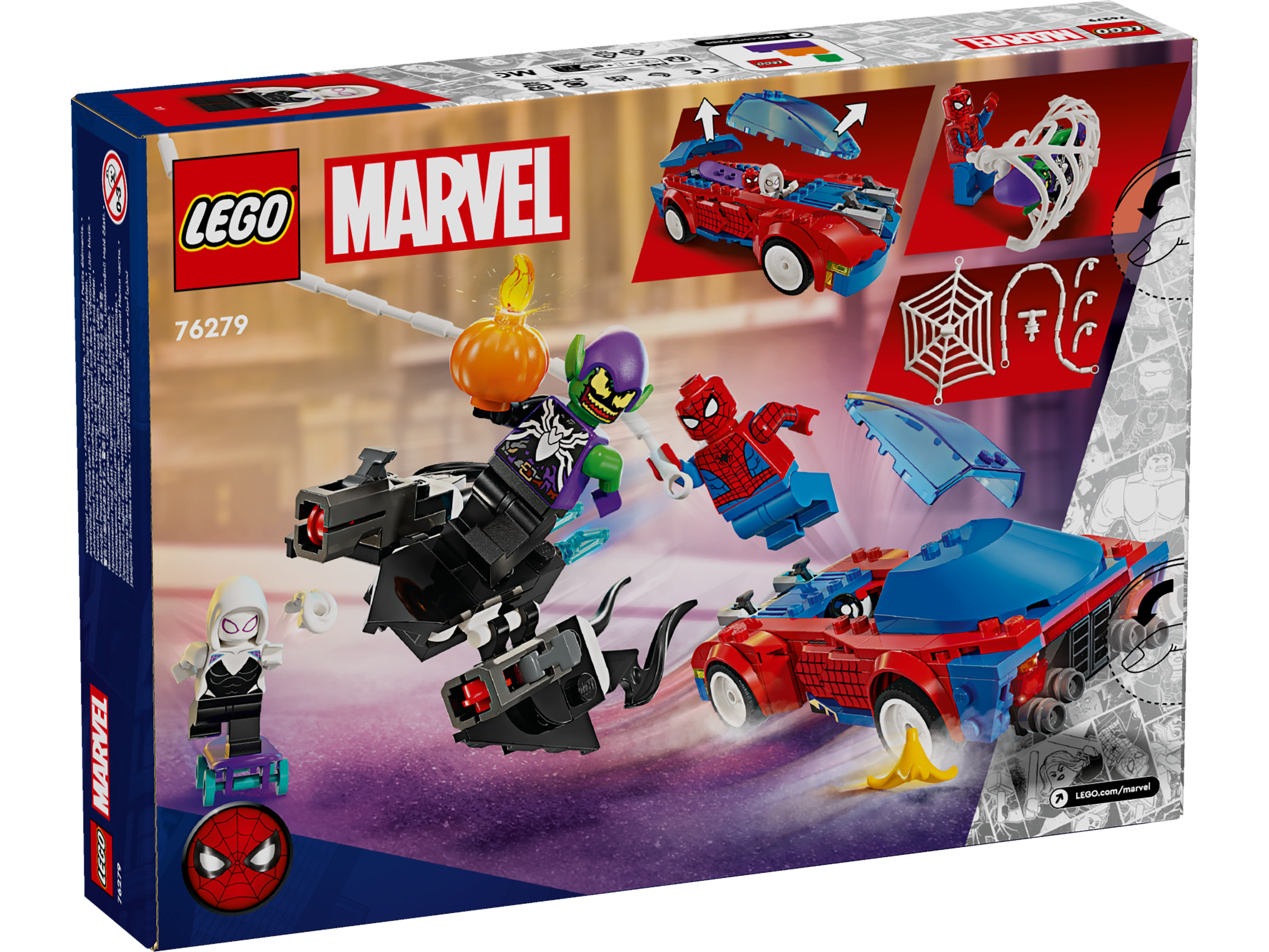 • Walki na kółkach z superbohaterami LEGO® — samochód Spider-Mana ma dwa miotacze klocków z przodu, szybowiec Zielonego Goblina także ma dwa miotacze klocków, a Ghost-Spider jeździ na deskorolce z dwoma ręcznymi miotaczami sieci