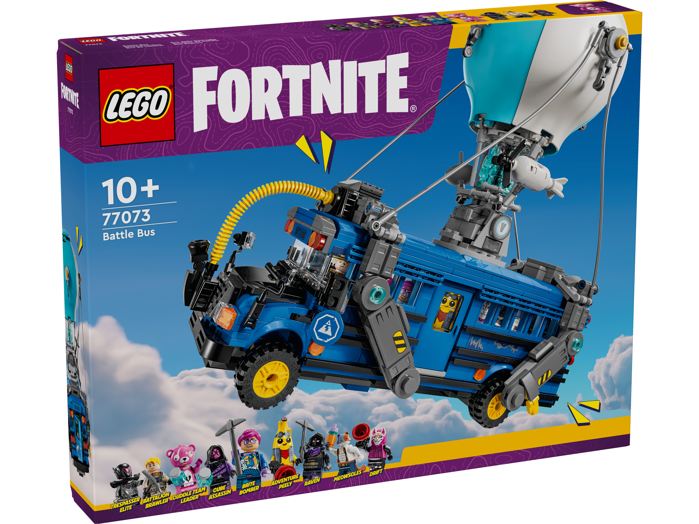 • Dziewięć minifigurek LEGO® Fortnite® — Bojownik Batalionu, Przygodowy Skórek, Bombowe Barwy, Dowódczyni Drużyny Przytulanek, Skrytobójczyni Sześcianu, Elitarny Intruz, Dryf, Miauśniak i Kruk