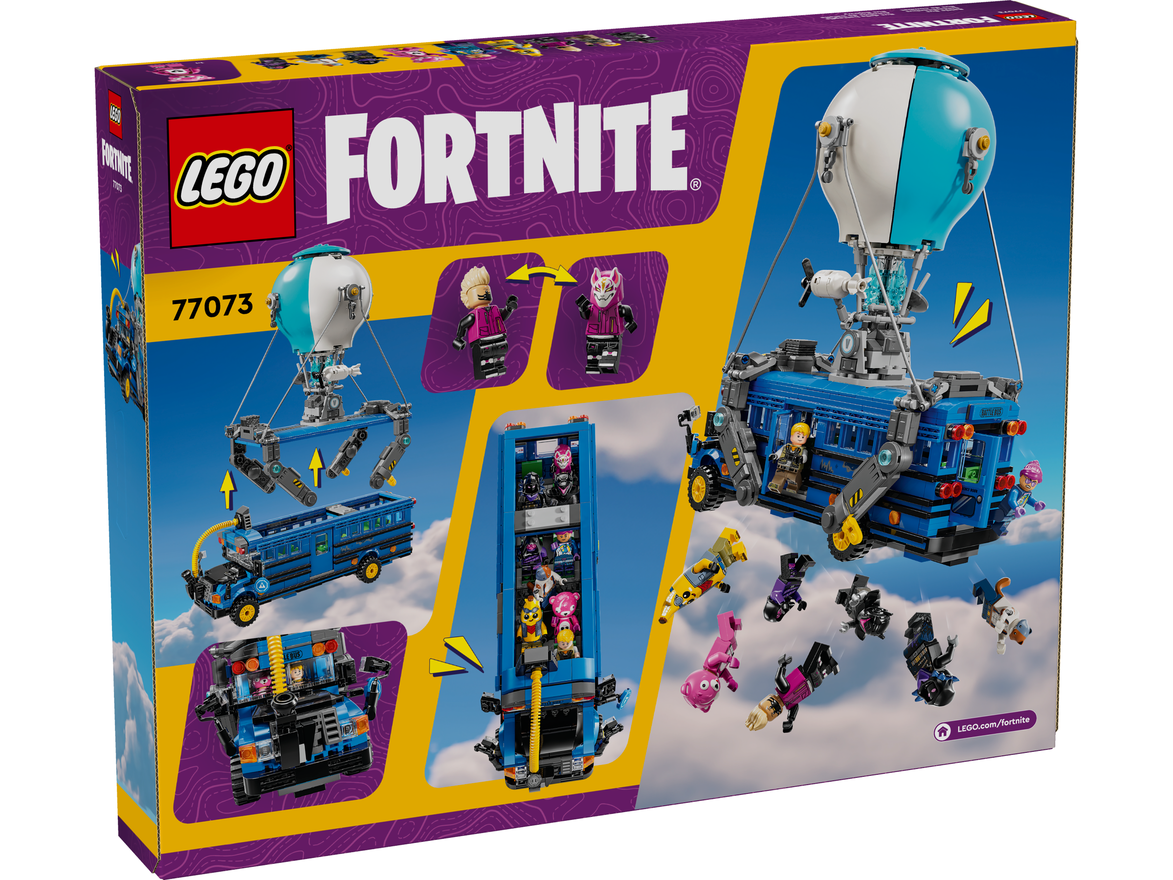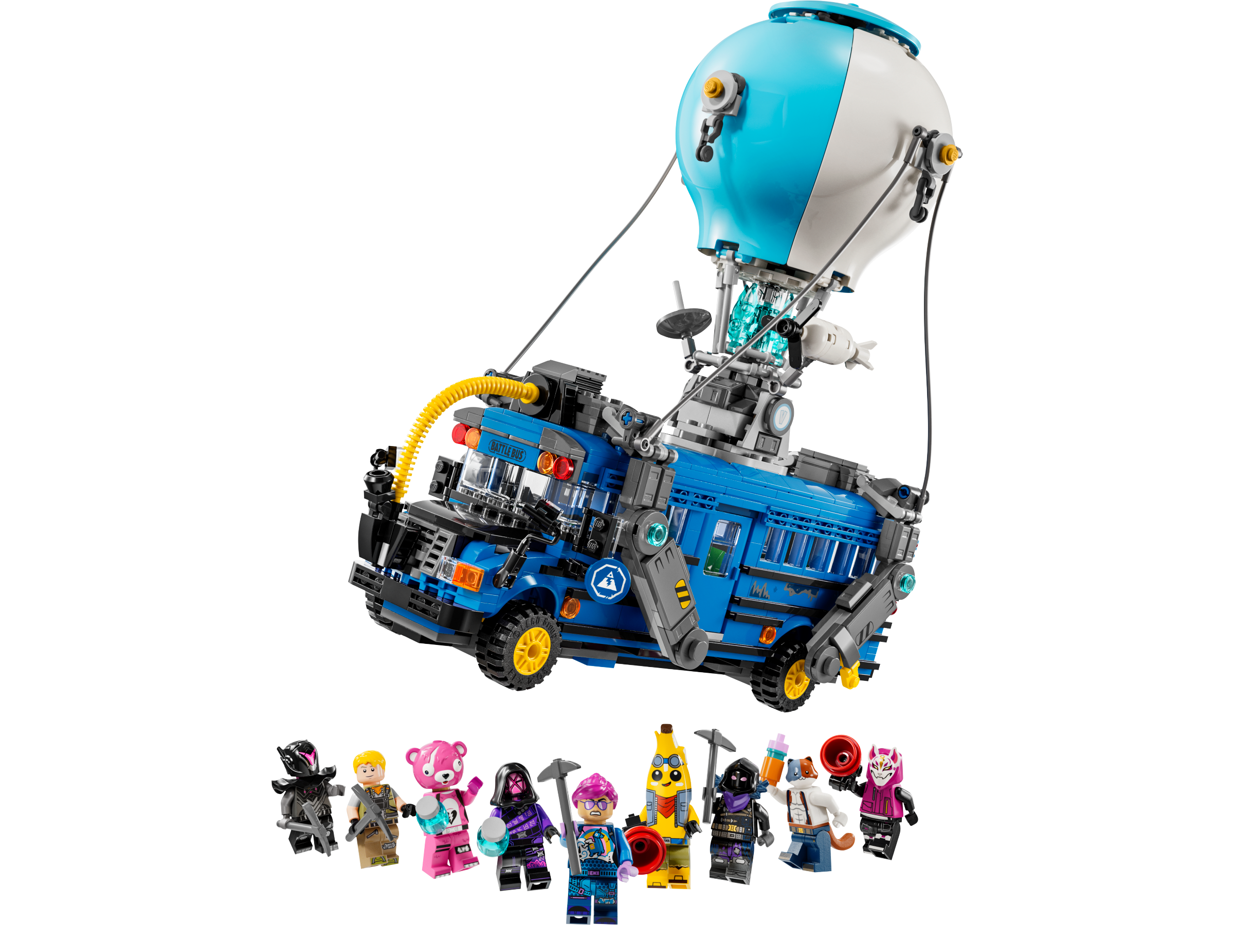 Przygotuj się na podróż do niesamowitego świata LEGO® Fortnite®! Zbuduj niesamowity Bus Bojowy, a potem wyrusz nim na przejażdżkę! Inspirowany pojazdem z gry wideo bus ma obracające się koła, zdejmowany dach i fajny balon na ogrzane powietrze! Jest pełen ekscytujących detali, takich jak sok Siorb, przysysak, kilofy i Kleposok, a także zawiera dziewięć minifigurek w ulubionych strojach!