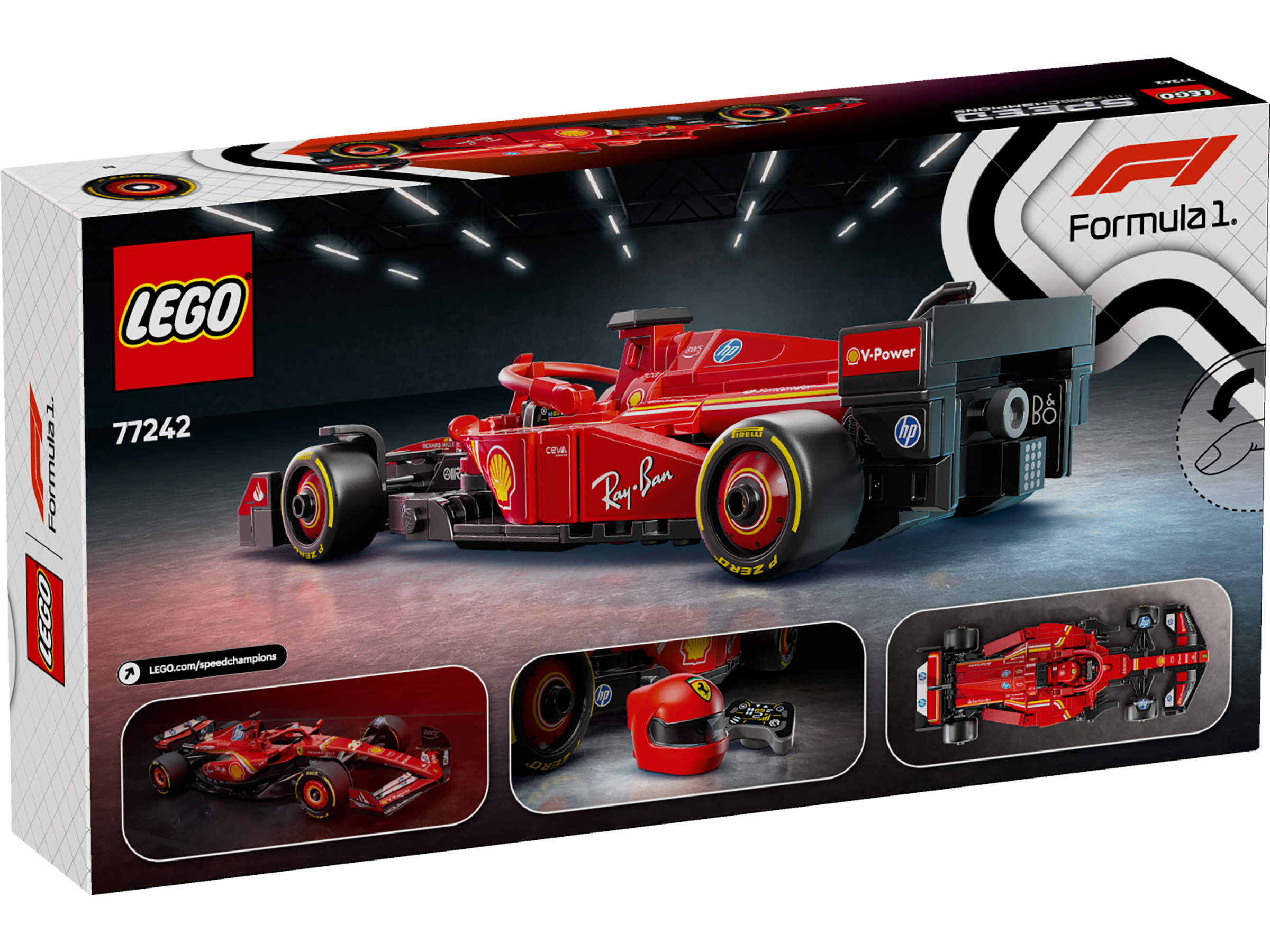 • Realistyczne detale zespołu Ferrari — bolid F1® ma elementy z prawdziwego bolidu z sezonu 2024, w tym tylny spojler, pałąk halo, naklejki sponsorów i szersze tylne opony z nadrukowanym napisem „Pirelli”