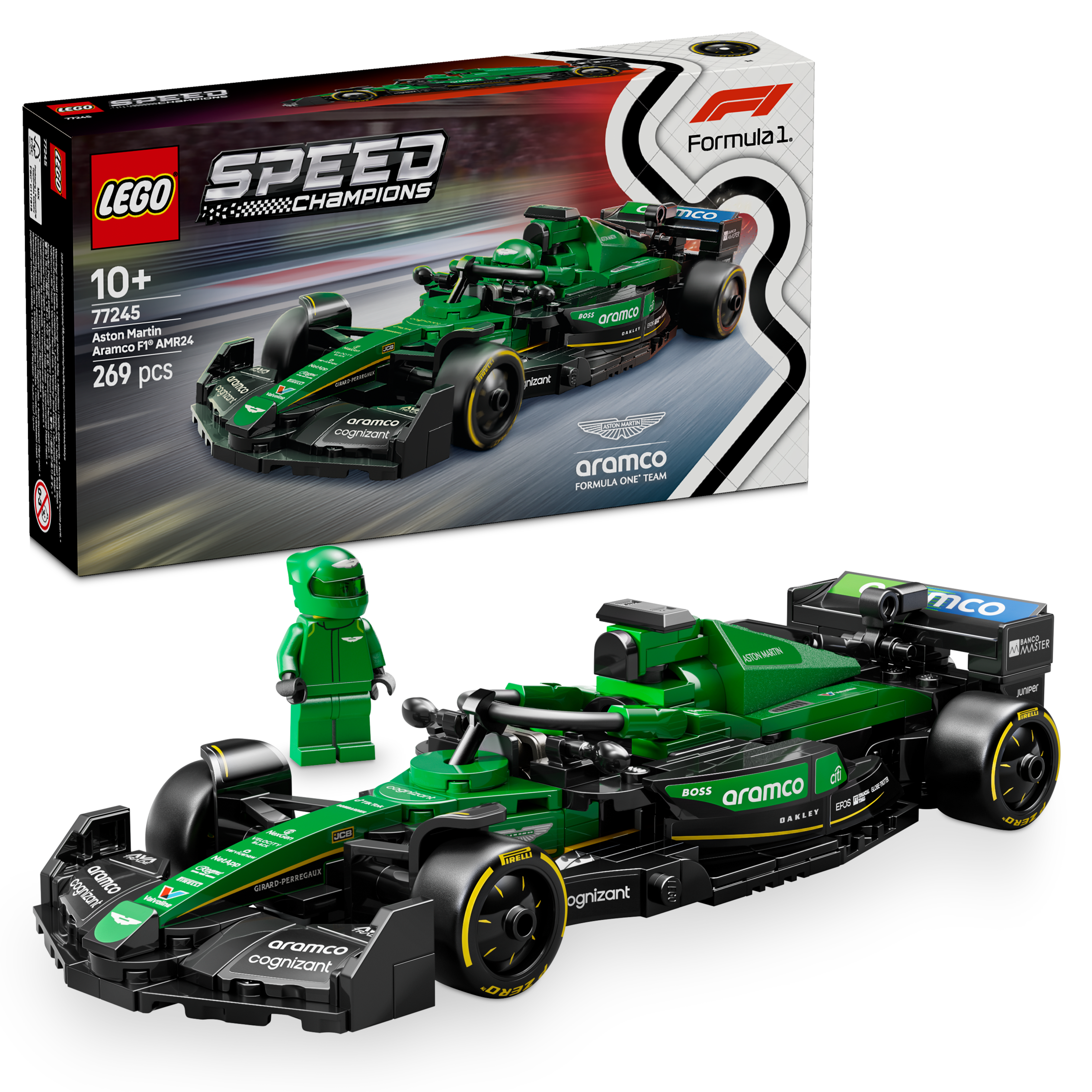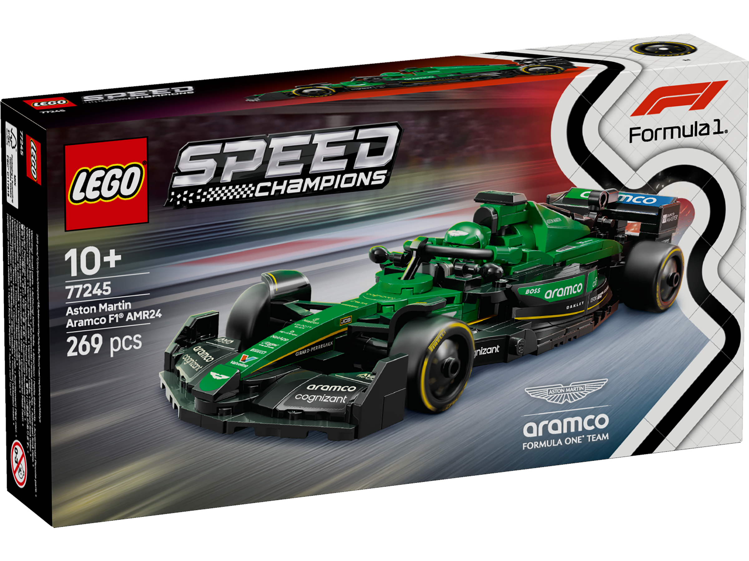 • Wymiary — zestaw składający się z 269 elementów zawiera model F1® Aston Martin Aramco AMR24 o wymiarach 4 cm wysokości, 20 cm długości i 7 cm szerokości