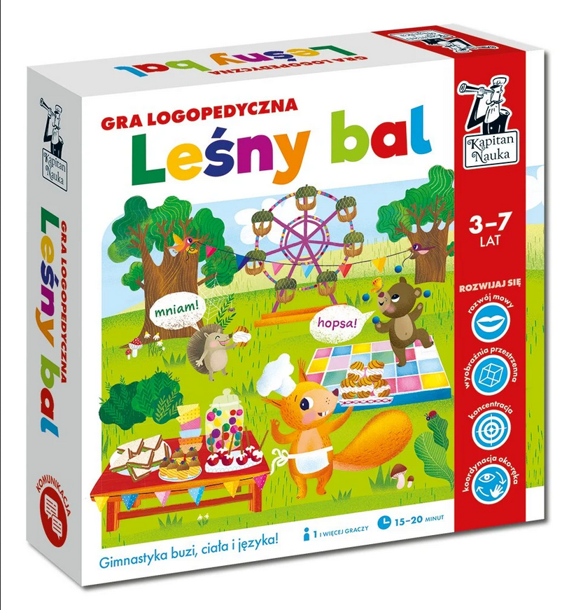 „Leśny bal” (3–7 lat) to gra logopedyczno-ruchowa zachęcająca dzieci do robienia tego, co lubią najbardziej: skakania, tańczenia, mlaskania czy wydawania śmiesznych odgłosów. Aktywizuje całe ciało, nie tylko buzię i język. Atrakcyjny temat leśnego przyjęcia ze zwierzątkami wprowadzi przedszkolaki w beztroską atmosferę zabawy i wygłupów, dzięki którym będą przygotowywać się do poprawnej wymowy wszystkich głosek oraz ćwiczyć równowagę, kontrolę i planowanie ruchów, a także doskonalić umiejętność współpracy.