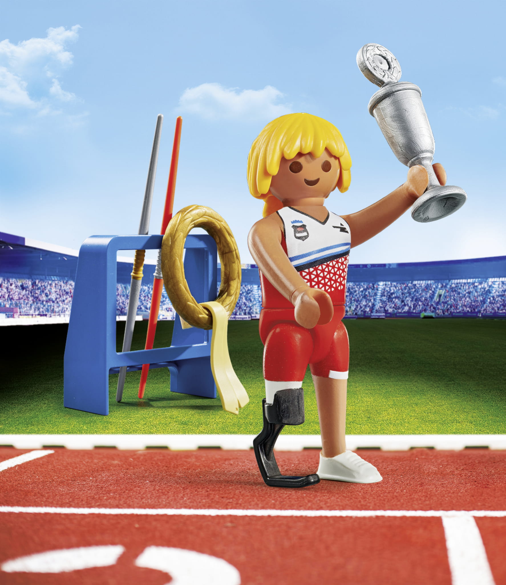 Paraolimpijski oszczepnik PLAYMOBIL Special Plus z oszczepem, wieńcem laurowym, dwoma oszczepami i trofeum.