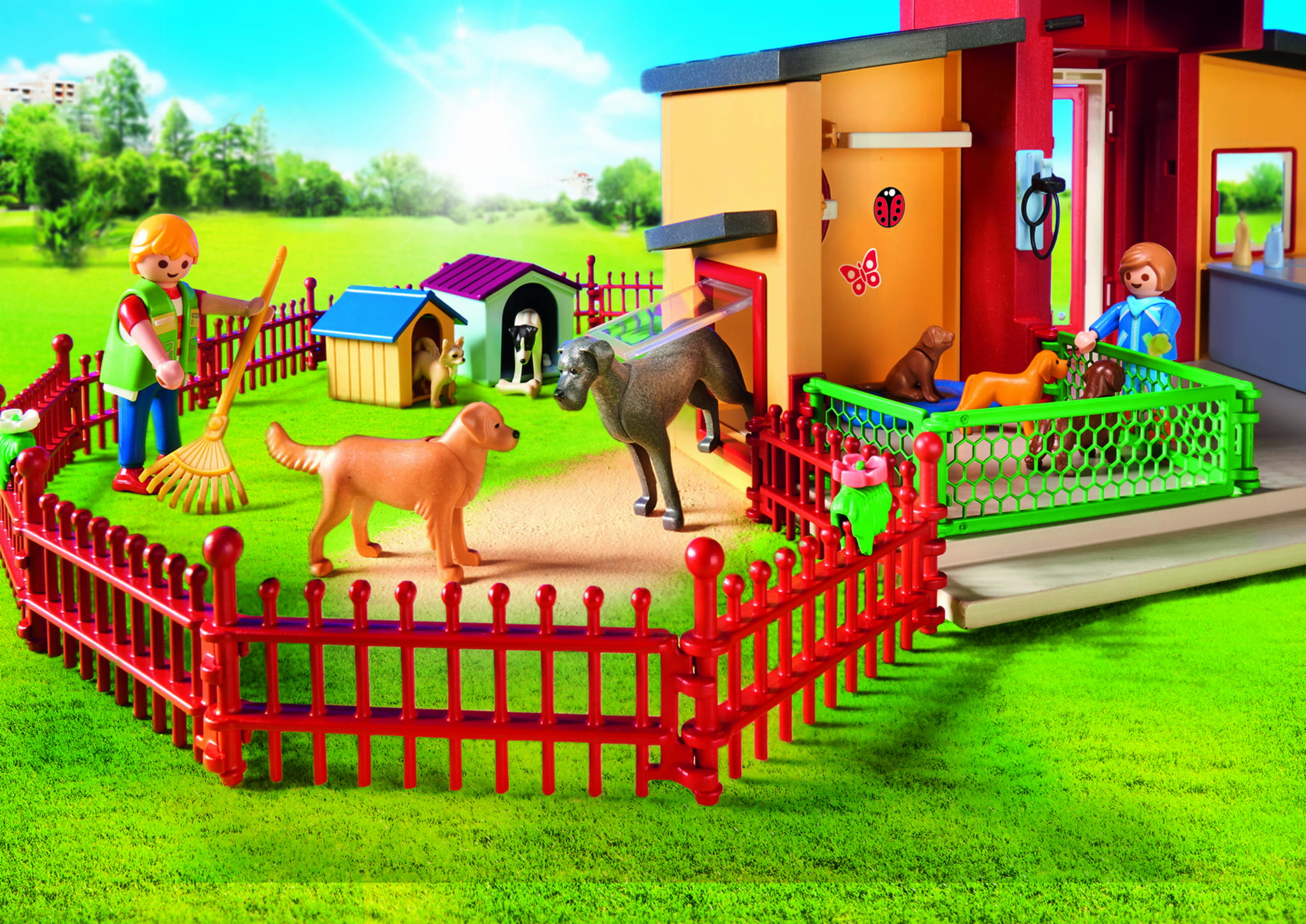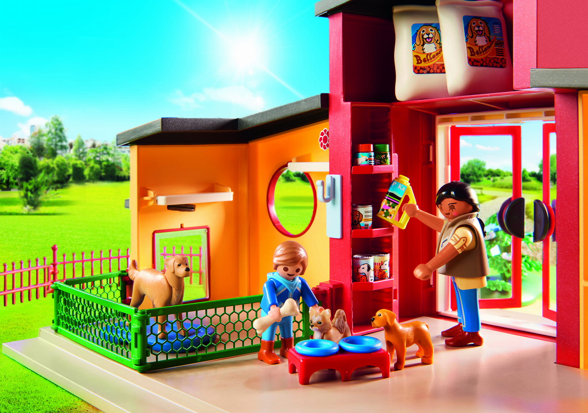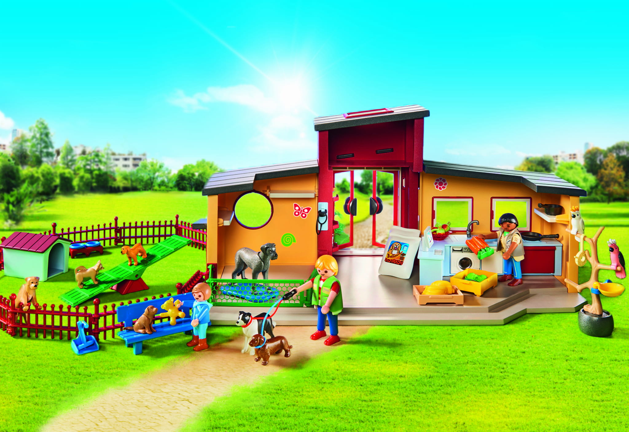 Akcesoria: 1 hotel dla zwierząt z wybiegiem, 12 elementów ogrodzenia, 2 lampy, 1 ławka, 1 huśtawka, 1 taczka, 1 krzak, 2 kwiaty, 1 aneks kuchenny z komputerem i pralką, 1 drewniana skrzynia, 1 skrzynia, 1 szklana miska, 1 miska dla ptaków, 1 uchwyt na miskę dla ptaków, 1 podwójna miska, 1 smycz dla psa, 1 podwójna smycz dla psa, 2 budy dla psów, 1 poduszka dla psa, 1 drzewko dla ptaków, 1 szufelka, 1 grabie, 1 miotła, 1 garnek, 1 patelnia, 3 jabłka, 1 banan, 1 melon, 1 pęczek marchwi, 1 sałata, 2 kości, 2 worki karmy dla psów, 3 puszki karmy dla psów, 1 łańcuch na kiełbaski, 1 obręcz na karmę, 1 karma dla ptaków, 2 słoiki, 1 tuba, 2 butelki z kosmetykami, 1 ręcznik kąpielowy, 1 pierścień, 1 miś pluszowy