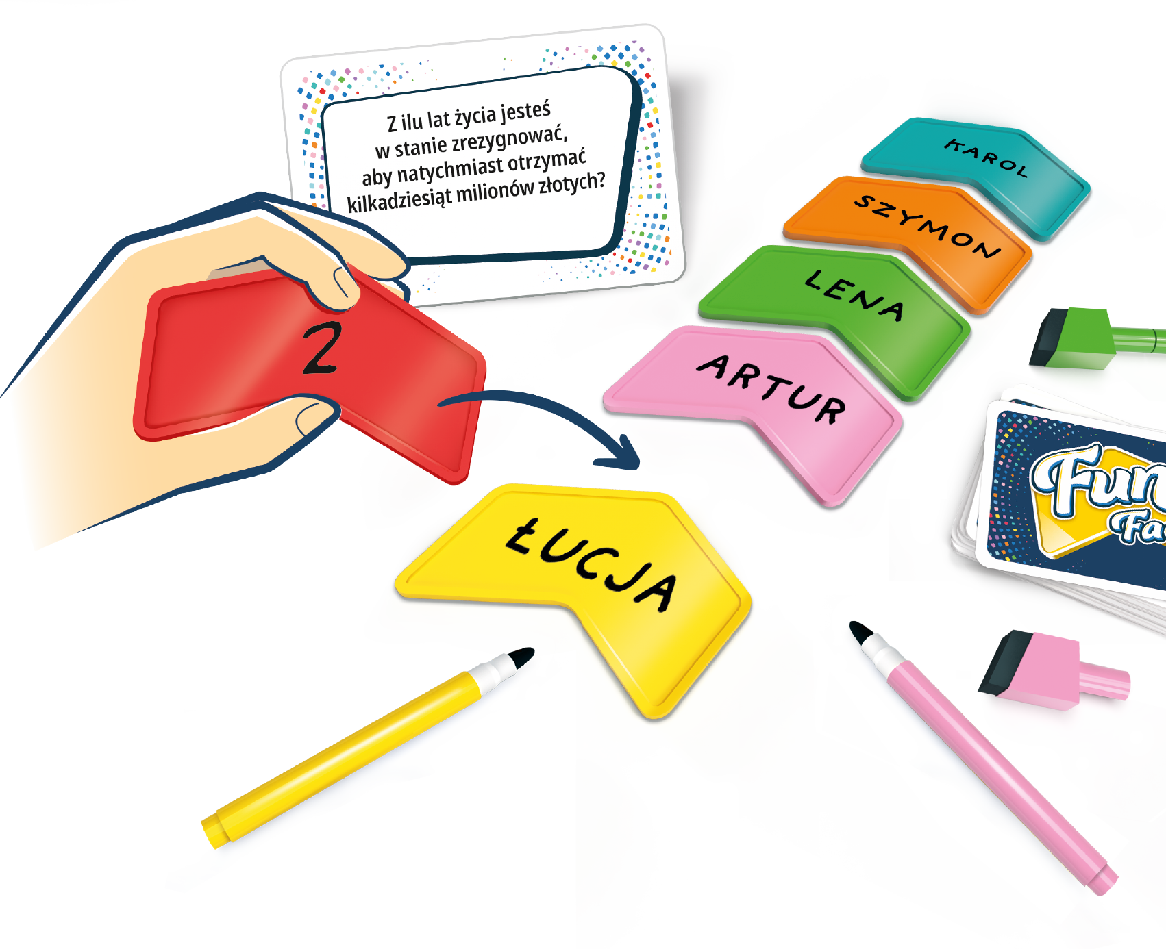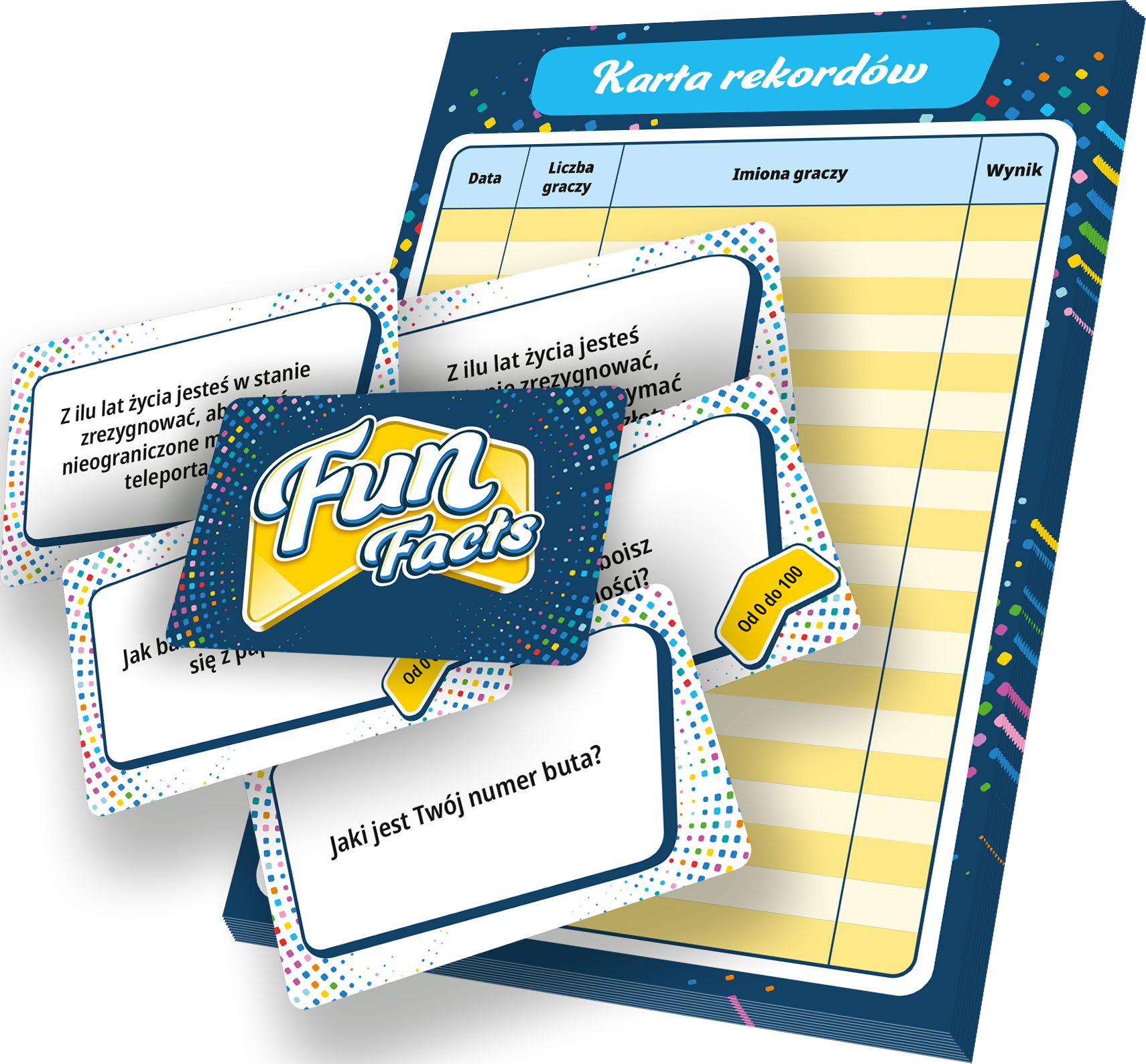 Wydaje Ci się, że Ty i Twoi znajomi świetnie się znacie? Fun facts to oparta na współpracy gra imprezowa, która pozwoli Wam to sprawdzić! W każdej turze odczytujecie na głos dość osobiste pytanie, na które odpowiadacie, wpisując na strzałkę pewną liczbę. Spróbujcie zgadnąć, jak odpowiedzieli pozostali gracze, i ułóżcie swoje odpowiedzi w kolejności rosnącej. Następnie odkryjcie je i sprawdźcie, czy mieliście rację!