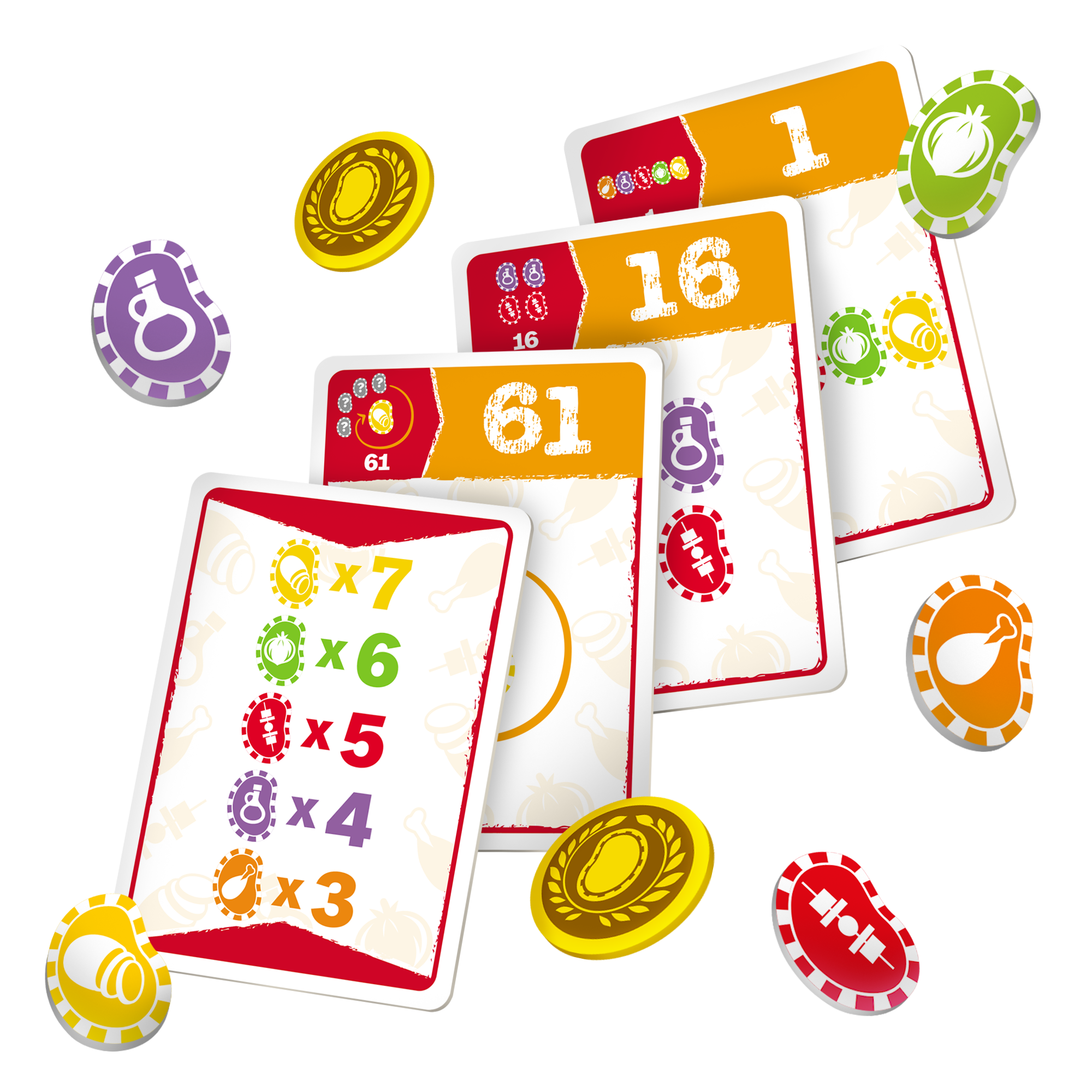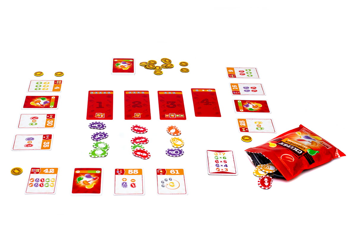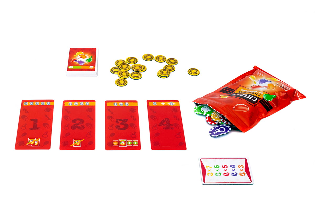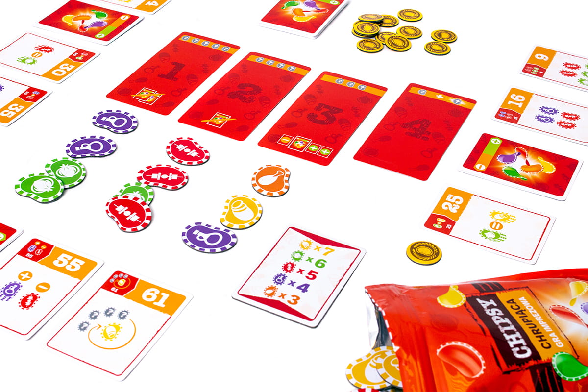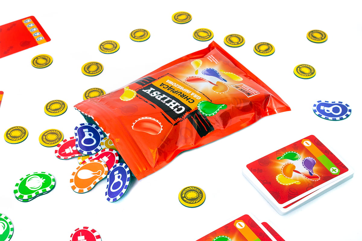 Chipsy to wciągająca niczym najpyszniejsza przekąska i doprawiona emocjami gra imprezowa, w której próbujemy oszacować prawdopodobieństwo zrealizowania kart celu. Na początku gry uczestnicy otrzymują ich po 6, a każdy związany jest z układem lub kolejnością pojawiania się kolejnych przekąsek. W toku gry będziemy odrzucali kolejne karty, zastanawiając się, czy warto postawić na bardziej wartościowy, ale ryzykowny cel. A może pewne punkty to dobre punkty, niezależnie od okoliczności?