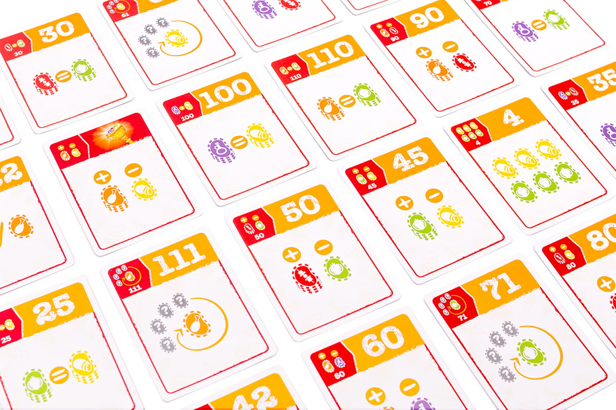 - Na początku każdej rundy gracze otrzymują po 6 kart zadań. Są one związane z układem i kombinacją kolorystyczną chipsów na koniec gry.